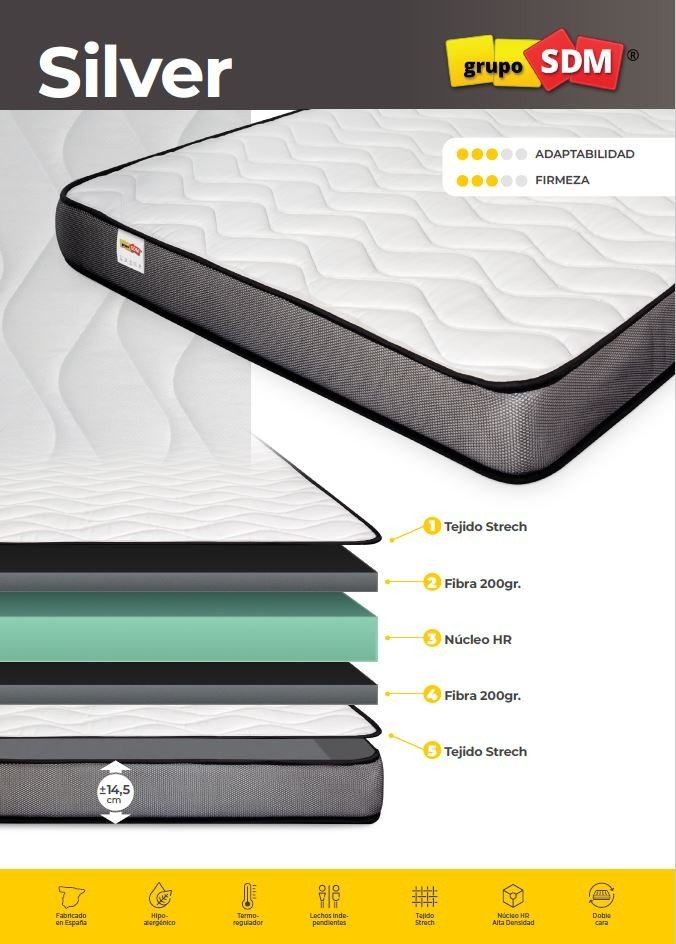 El Colchón Silver te aportará un sueño relajante y reparador a un precio imbatible. Incorpora un tratamiento antiácaros gracias a las 2 capas de fibras hipoalergénicas que lo componen, además de aportar una gran transpirabilidad, gracias al Tejido Strech de su revestimiento, evitando así los malos olores.