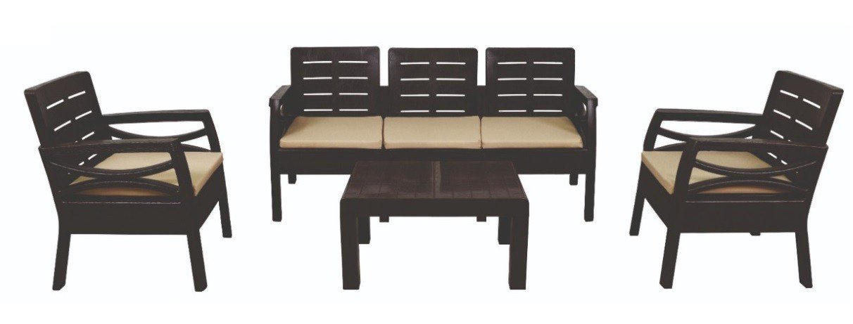 Conjunto compuesto de: 2 unidades de Sillón, 1 unidad de Sofá de 3 plazas y una unidad de mesa baja, polipropileno color marrón. Cojines incluidos. Uso exterior e interior