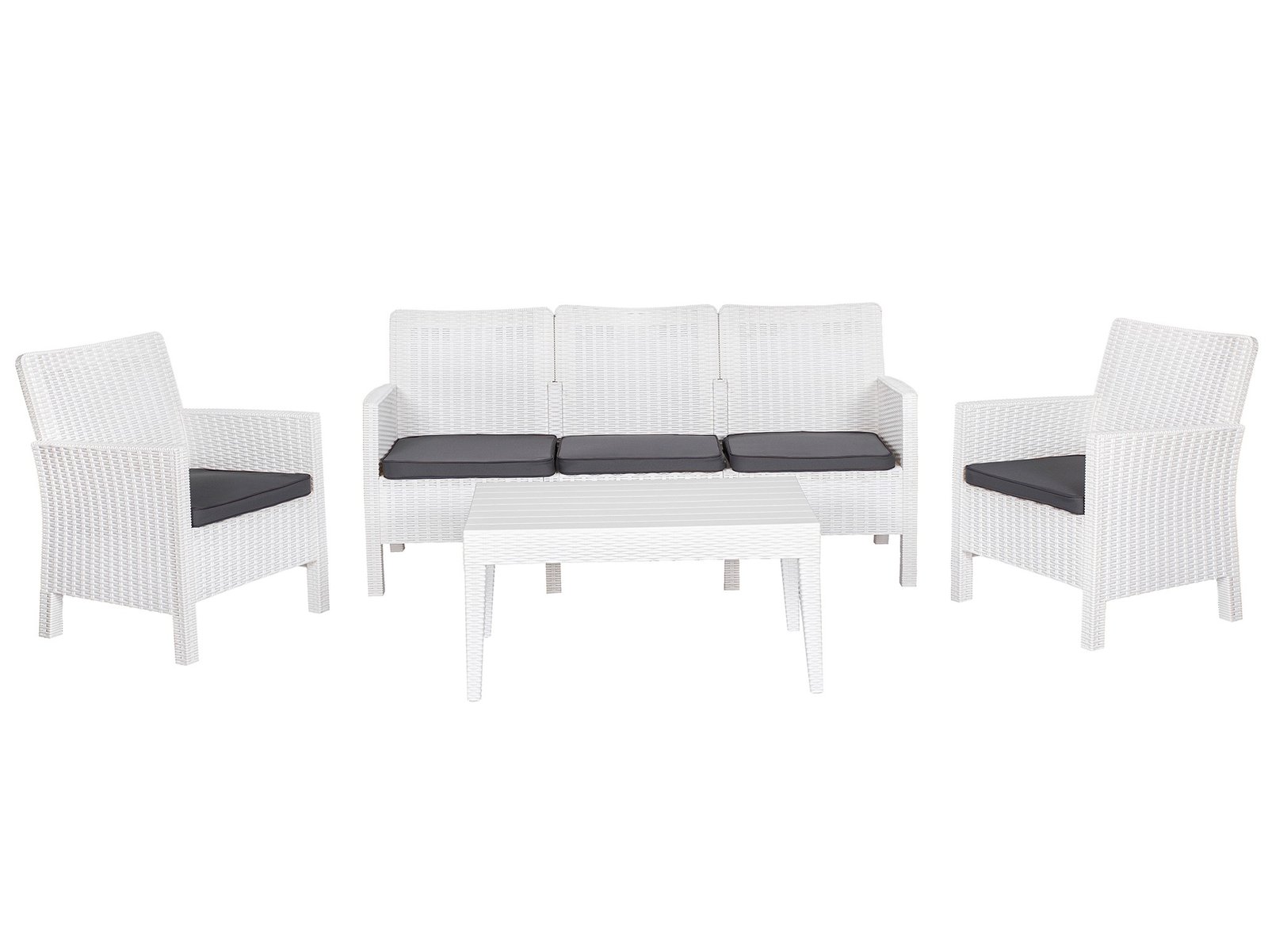 Set compuesto de: 2 unidades de Sillón, 1 unidad de Sofá de 3 plazas y una unidad de mesa baja, 100 % polipropileno color blanco. Cojines incluidos. Uso exterior e interior