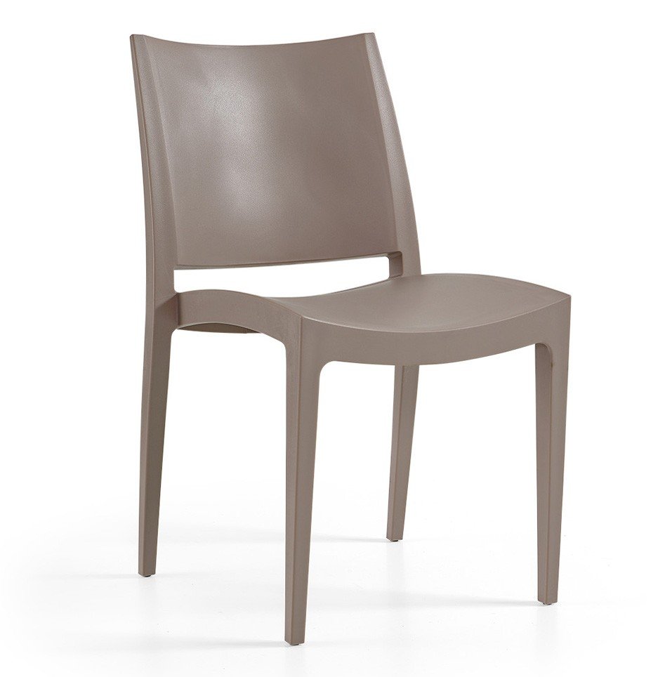 Silla de diseño, apilable, polipropileno inyectado de color tórtora, reforzada con fibra de vidrio. Tratamiento anti rayos UV. Uso en exterior e interior. Otros colores disponibles.