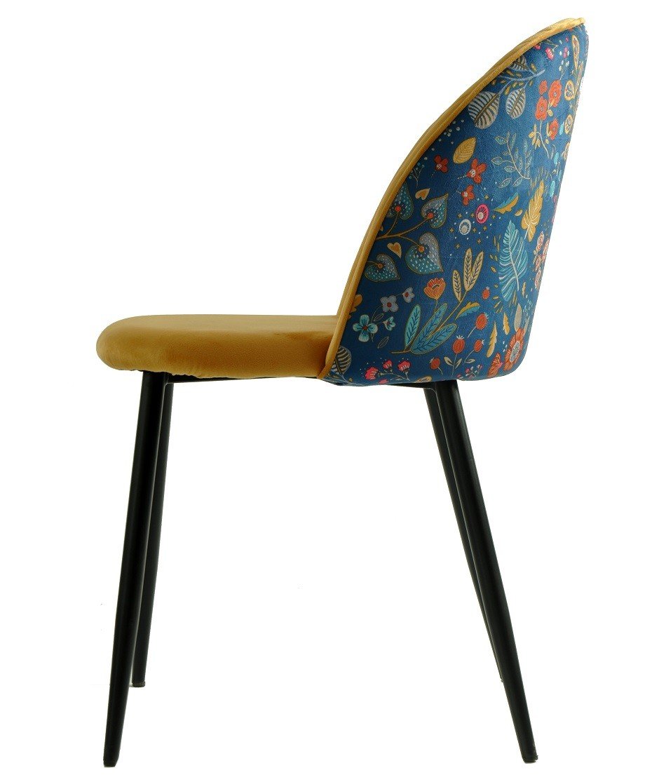 Silla de diseño, armazón metálico con acabado epoxi negro, asiento y respaldo tapizados en terciopelo amarillo, trasera en tejido decorado carnaval. Otros colores disponibles. Taburete a juego