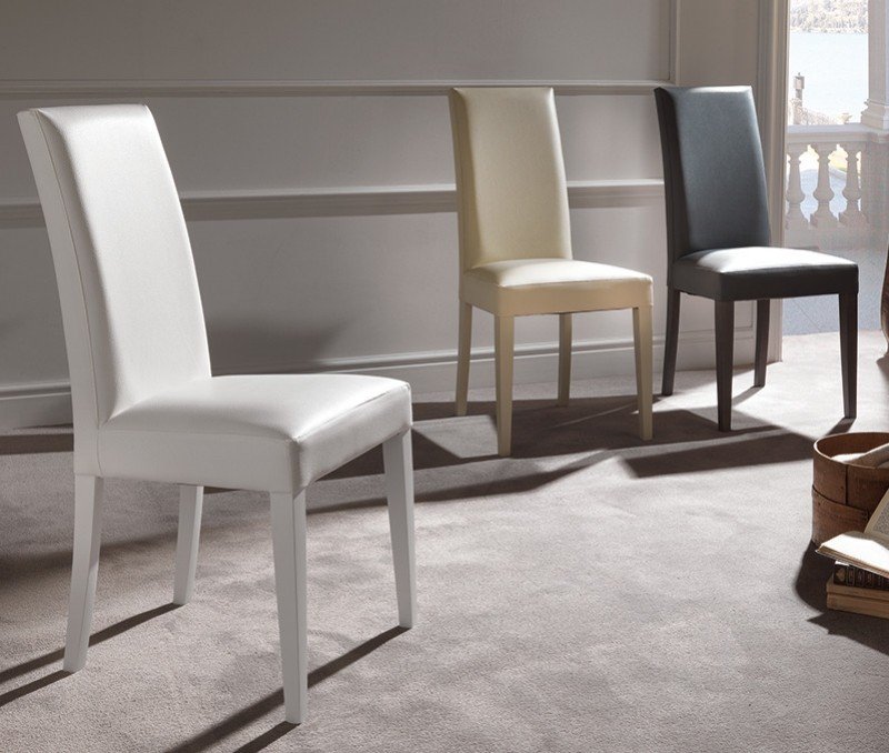 Silla de diseño, multiusos, madera de haya, patas lacadas en blanco, tapizada en similpiel gris claro. Otros colores disponibles.