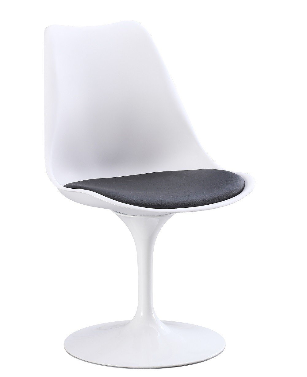 Silla de diseño, base metálica y asiento de polipropileno blanco, cojín de similpiel negro. Mesas y sillones a juego. Otros colores disponibles