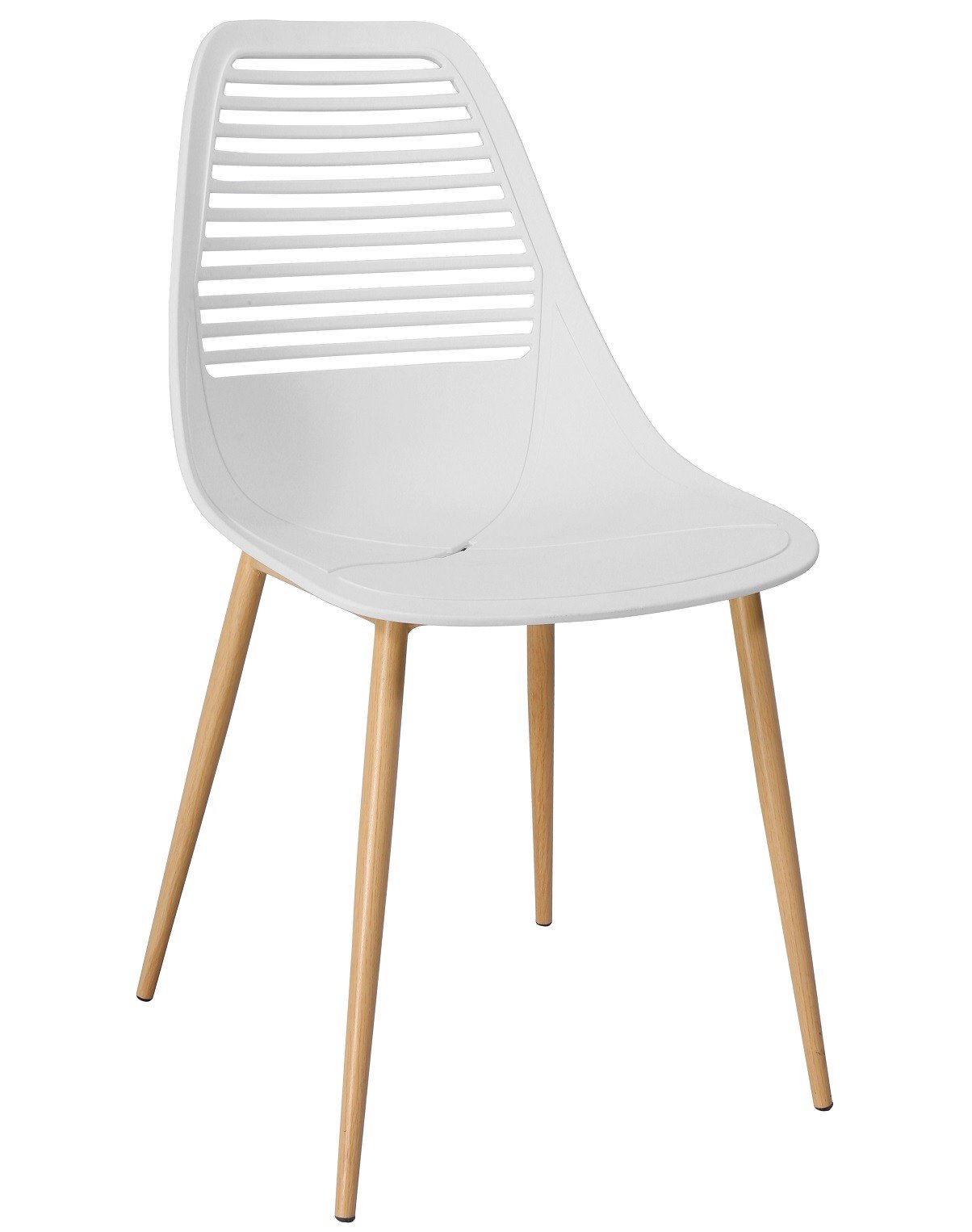 Silla de diseño, base de metal con acabado imitación madera, asiento y respaldo de polipropileno inyectado de color blanco. Otros colores disponibles. Taburete del mismo color