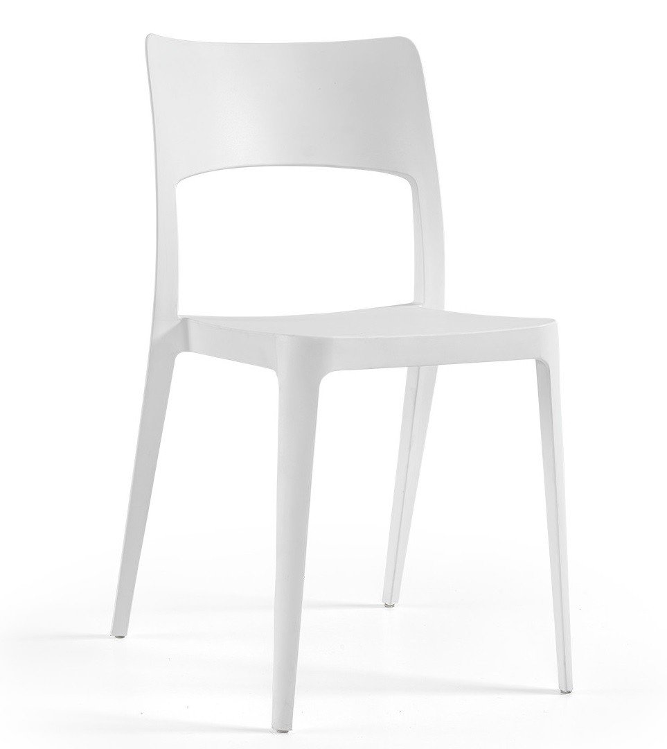 Silla de diseño, apilable,  polipropileno inyectado de color blanco, reforzada con fibra de vidrio. Tratamiento anti  rayos UV. Uso en exterior e interior. Otros colores disponibles.